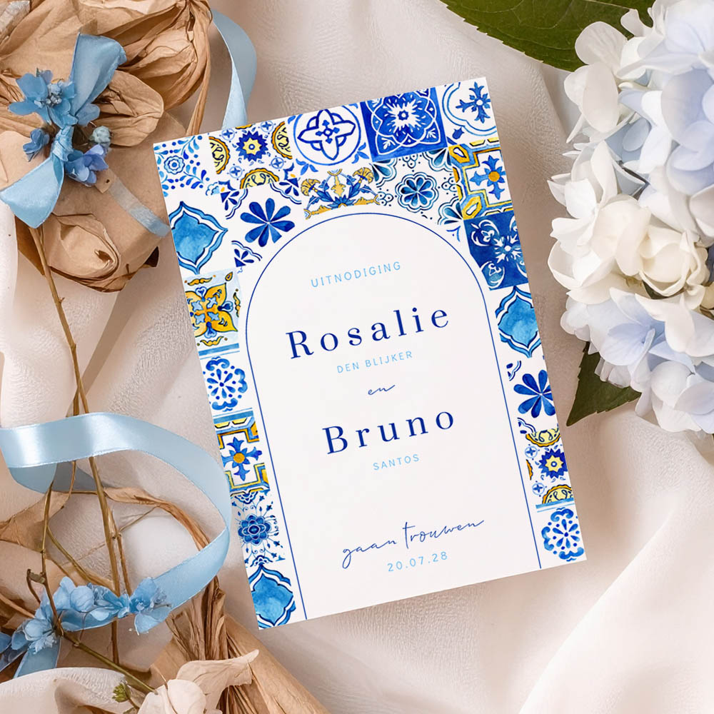 Trouwkaart met een patroon van mediterrane tegeltjes. In de boogvorm staat de tekst. Deze trouwkaart heeft en origineel ontwerp en zal zeker indruk maken op de genodigden. Pas deze trouwkaart naar je eigen smaak aan in de editor en combineer met een mooie envelop om het helemaal af te maken.