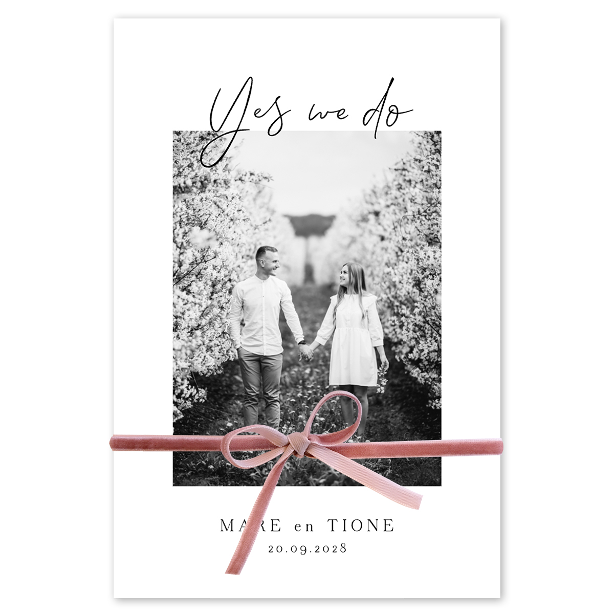 Trouwkaart met eigen foto en oudroze fluwelen lint. De deze basic trouwkaart is ruimte voor een eigen foto. Boven de foto staat de tekst 'yes we do' en onder de foto staan jullie namen met de trouwdatum. Pas de teksten en kleuren zelf aan in de online editor.