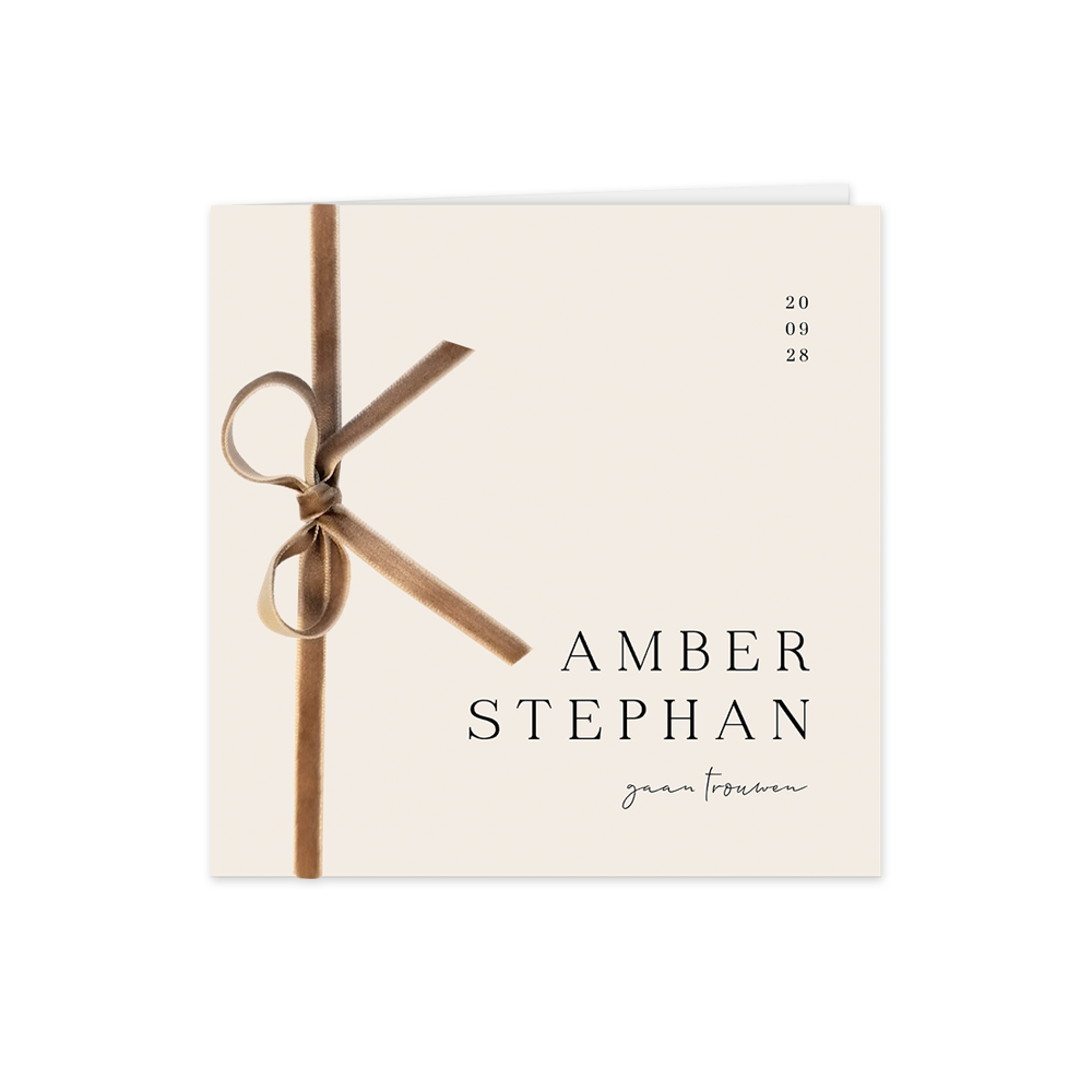 Klassieke en rustige trouwkaart met de toevoeging van velours lint in de kleur taupe. De kleur van het lint kies je natuurlijk helemaal zelf. De achtergrond van de kaart heeft een licht beige tint en jullie namen staan sierlijk op de voorzijde. Pas makkelijk de kleuren, lettertypes aan en voeg eenvoudig een eigen afbeelding aan deze trouwkaart toe.