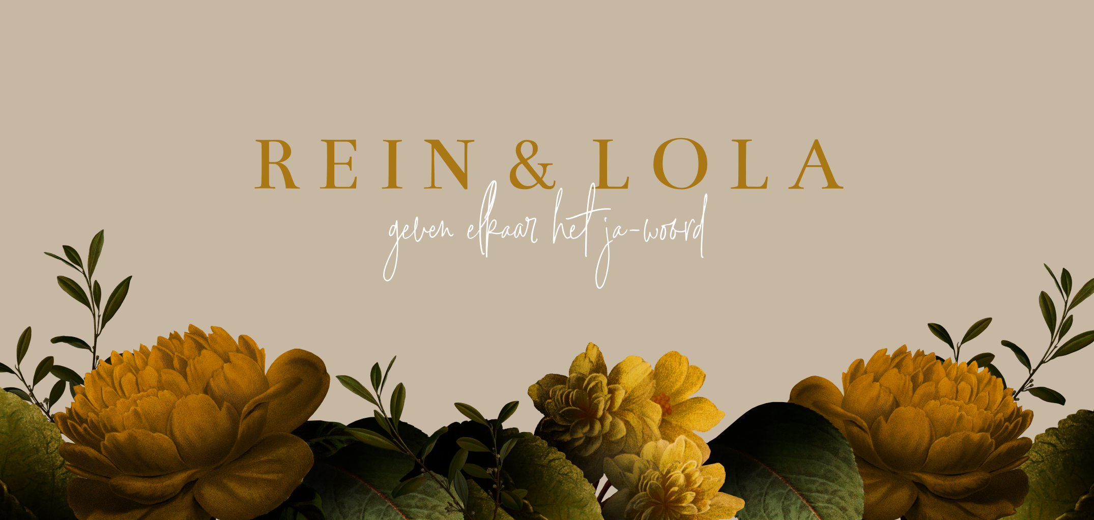Moderne stijlvolle trouwkaart met een zandkleurige achtergrond. Jullie namen staan geschreven in sierlijke letters. De combinatie met de gele bloemen maakt dit een hippe en stijlvolle huwelijksuitnodiging.