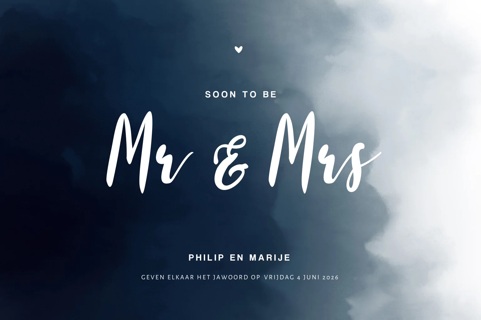 Moderne Mr and Mrs trouwkaart met een donkerblauwe aquarel achtergrond. Het verloop van het aquarel geeft een mooi effect. Maak deze huwelijksuitnodiging persoonlijk door de teksten en lettertypes naar je eigen smaak aan te passen.