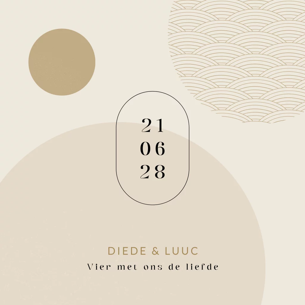 Trendy trouwkaart met organische vormen. Deze trouwkaart is overwegend rustig door de neutrale beige en bruine tinten. Pas de kaart geheel naar eigen wens aan in de editor. Vragen? Laat het ons weten!