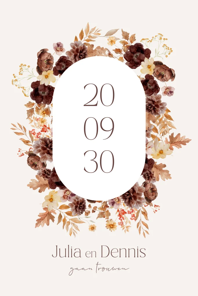 Trouwkaart met een klassieke uitstraling. Deze trouwkaart heeft een prachtig ovaal bloemenkader van bruine bloemen, perfect voor een herfstbruiloft. Pas deze huwelijksuitnodiging geheel naar eigen wens aan in de editor, zodat het precies bij jullie bruiloft past. Vragen? Laat het ons weten!