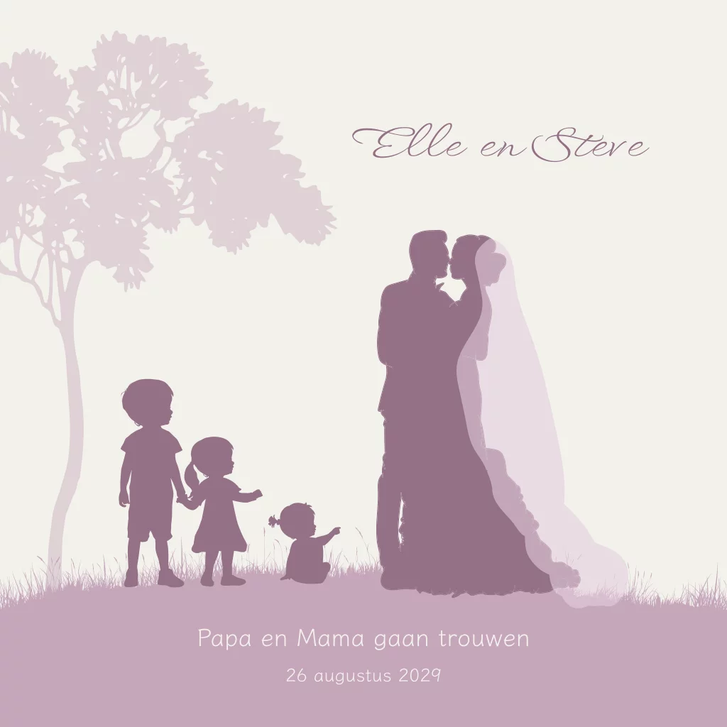 Papa en mama trouwen trouwkaart met een silhouet van een gezin, papa en mama als bruidspaar met hun drie kinderen in de natuur. Deze huwelijkssluitingen heeft mooie paarse kleuren in verschillende kleurtinten. Je kunt deze kaart zelf bewerken in de editor en naar je eigen wensen aanpassen.