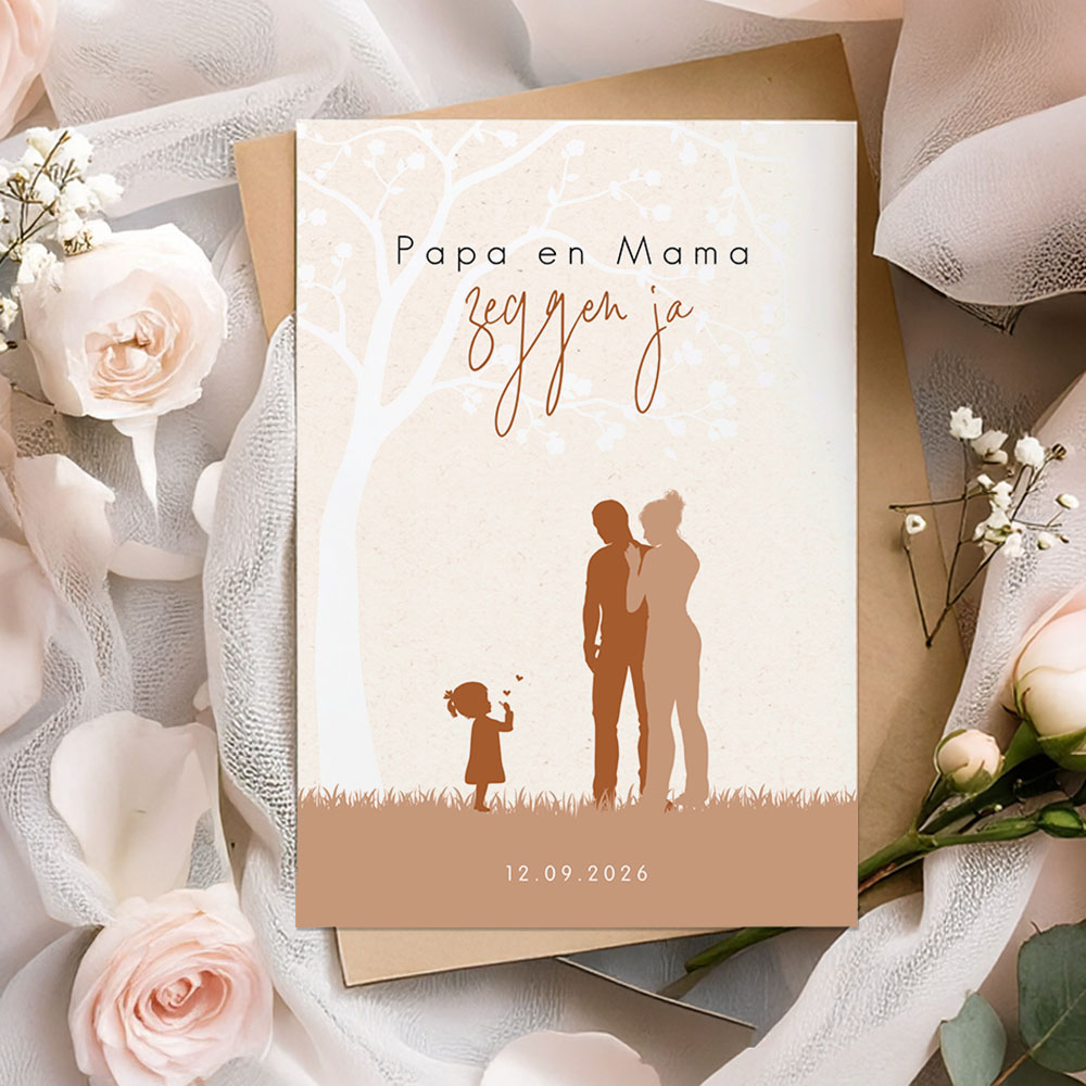 Papa en mama gaan trouwen! Een leuke silhouet trouwkaart van een gezin. Pas deze lieve trouwkaart naar eigen wens aan. Andere gezinssamenstelling is ook mogelijk. Bekijk de opties in onze online editor of stuur ons een berichtje. De roestbruine envelopkleur maakt deze trouwkaart helemaal af.