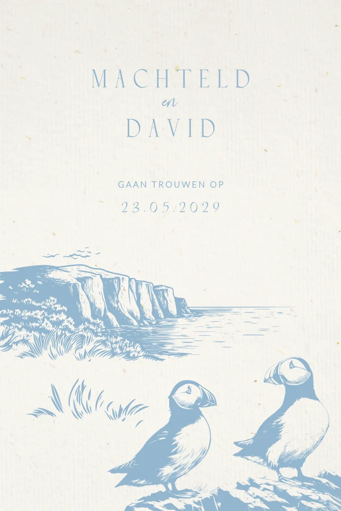 Originele trouwkaart met een illustratie van een landschap van een klif en papegaaiduikers in zachte blauwe tinten. Deze huwelijks uitnodiging heeft een papierlook achtergrond. De ronde hoeken maken de uitnodiging helemaal af. Je kunt de kaart naar je eigen wensen aanpassen in de editor. Hulp nodig bij het ontwerpen? Neem contact met ons op!