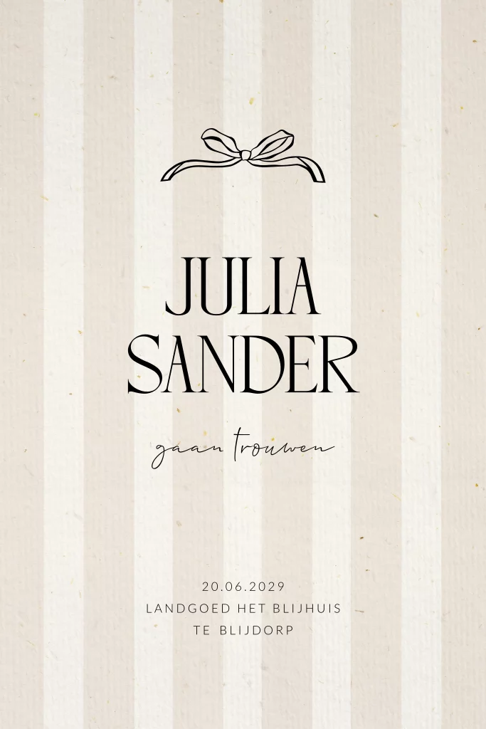 Papierlook trouwkaart met streep patroon en een getekende strik. Deze trouwuitnodiging heeft neutrale kleuren met een zandkleurig patroon van strepen. Perfect voor een rustige trouwerij. Pas de kaart in de editor eenvoudig aan naar je eigen wens.