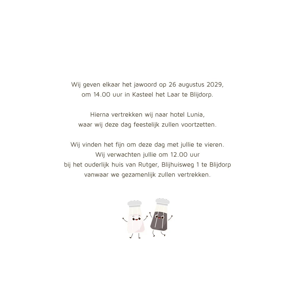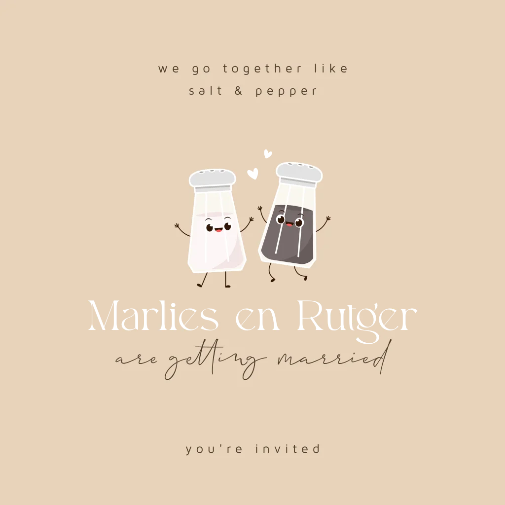 Grappige trouwkaart met een illustratie van een peper en zout stel en de grappige tekst 'We go together like salt & pepper'. Deze beige huwelijksuitnodiging bevat goudfolie wat zorgt voor een extra vleugje luxe. Pas de kaart eenvoudig aan in de editor en maak af met een bijpassende envelop.
