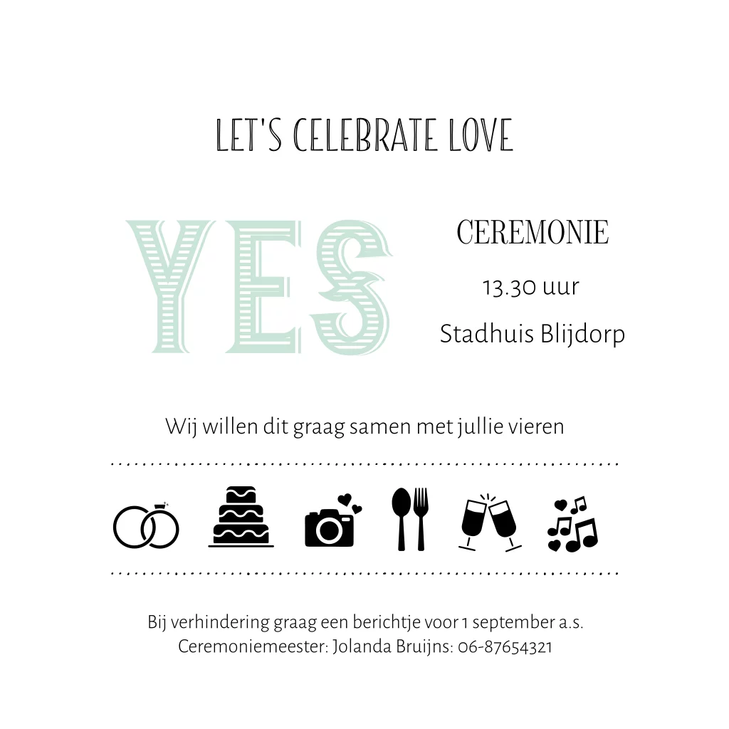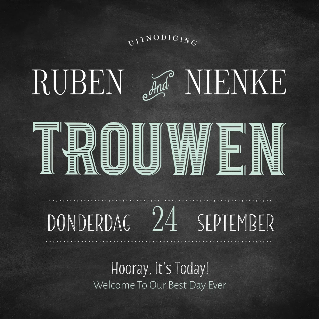 Typografische retro trouwkaart met een krijtbord achtergrond. Op deze kaart staan diverse symbolen zoals ringen, proostende glazen en taart. Er zijn verschillende lettertypes gebruikt en de tekstkleuren zijn wit en pastel groen. De teksten en symbolen zijn gemakkelijk aan te passen.