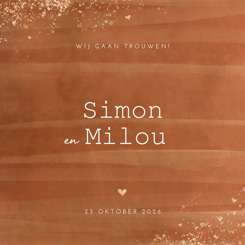 Hippe trouwkaart met een trendy roestbruine achtergrond en goudkleurige spetters. Deze uitnodiging is onderdeel van onze trouwhuisstijl Roest .