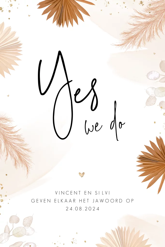 Een stijlvolle trouwkaart om jullie gasten uit te nodigen. De roze bloemen en sierlijke letters geven de kaart een romantische uitstraling. Een mooie match met de roze aquarel aan de onderzijde.