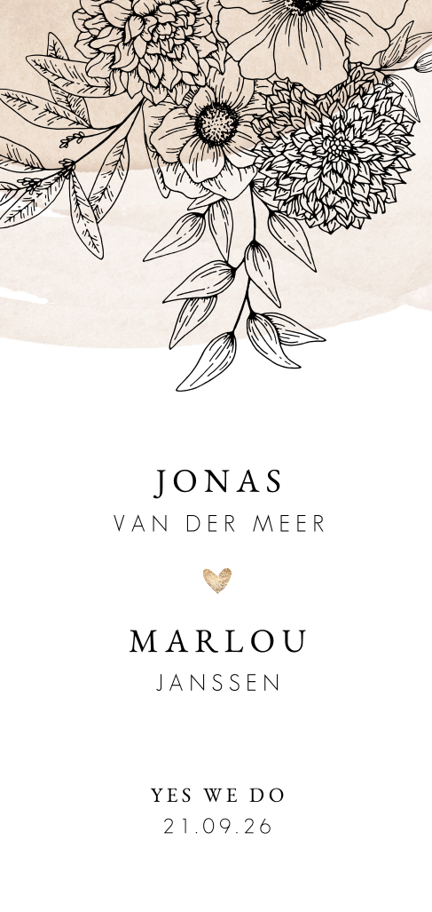 Stijlvolle romantische trouwkaart met zwart getekende bloemen, aquarel en een gouden hartje.
