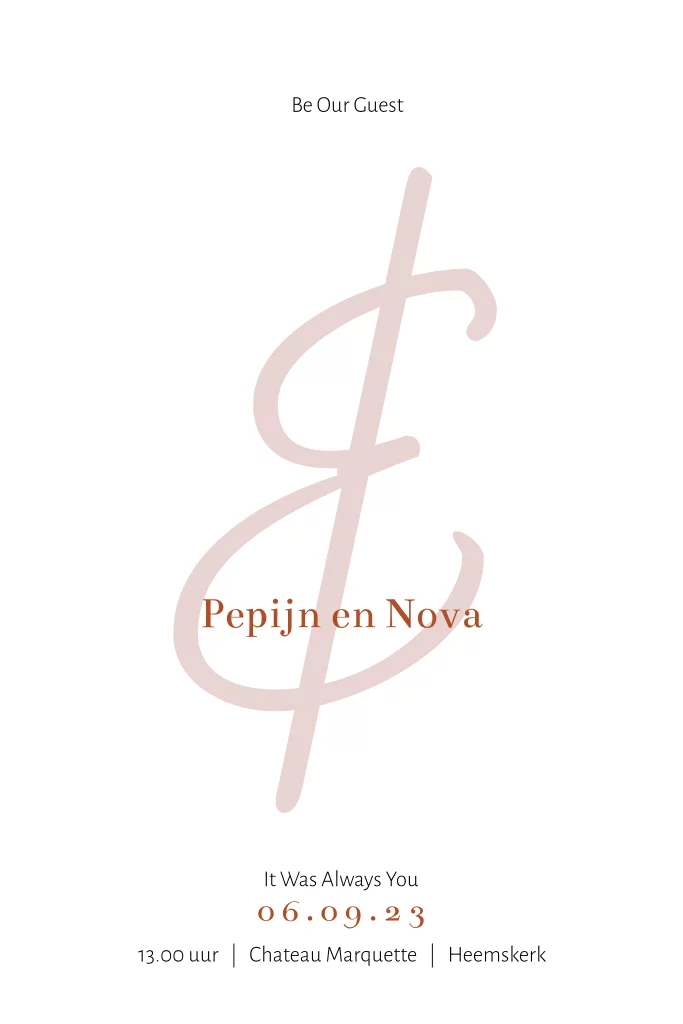 Romantische trouwkaart met op de achtergrond een en-teken in een zachte kleur roze. De kaart is overwegend wit en clean. Pas de kleuren en teksten naar wens aan in de editor.
