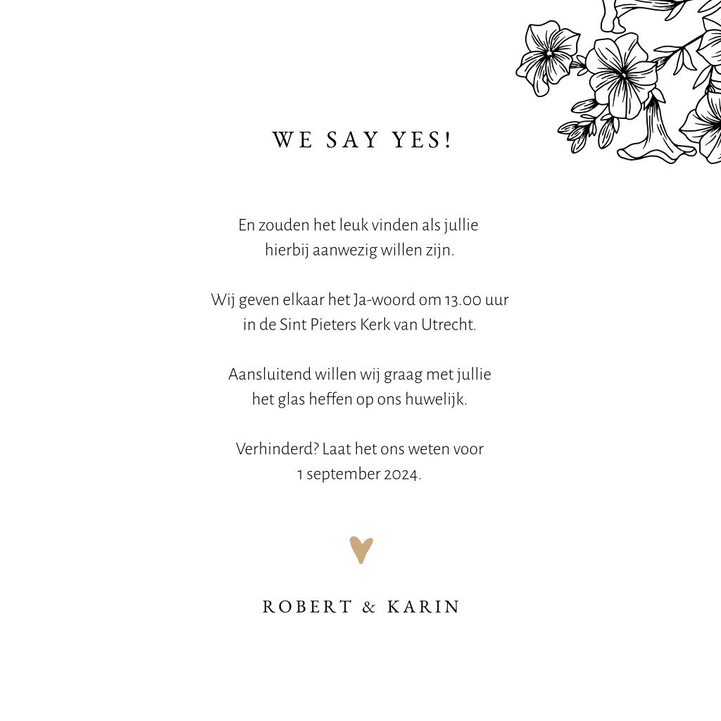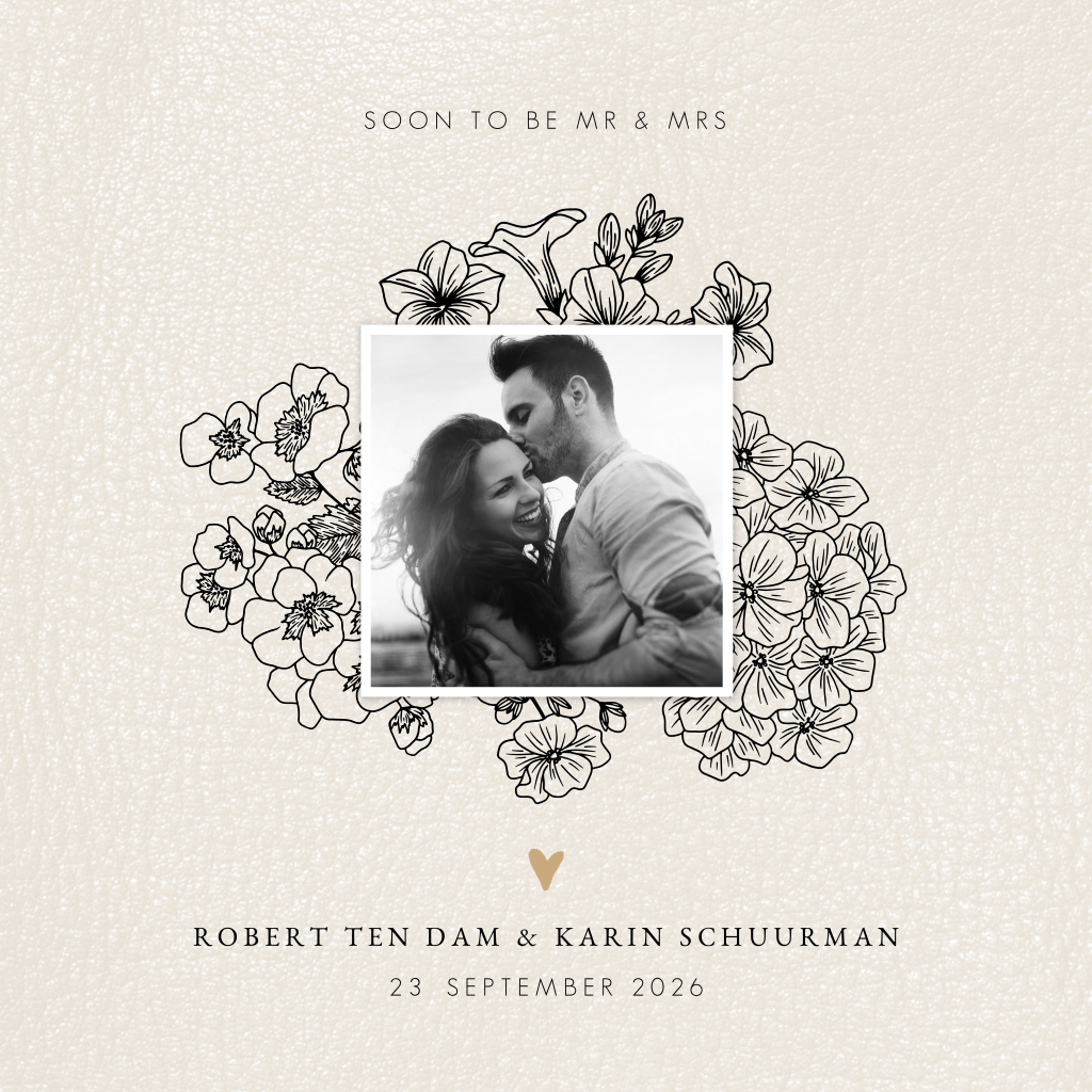 Een stijlvolle trouwkaart voor de Mr & Mrs to be! Op deze kaart gebruik je je eigen persoonlijke foto. Achter het fotokader staan sierlijke bloemen en takjes. Een erg leuke combinatie met de zandkleurige hartjes.