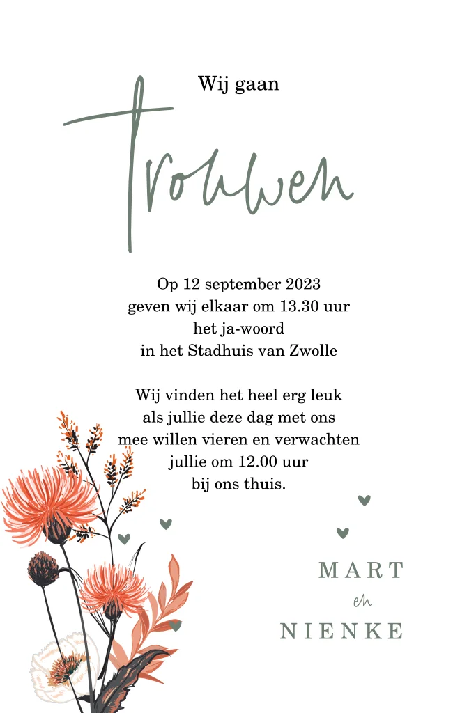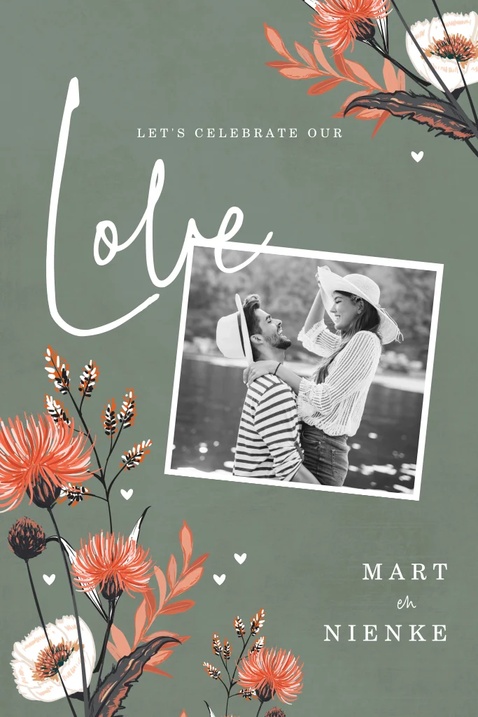 Kondig jullie huwelijk aan met deze hippe foto trouwkaart met romantische bloemen. Plaats je eigen foto en maak van deze kaart je eigen persoonlijke huwelijksuitnodiging.