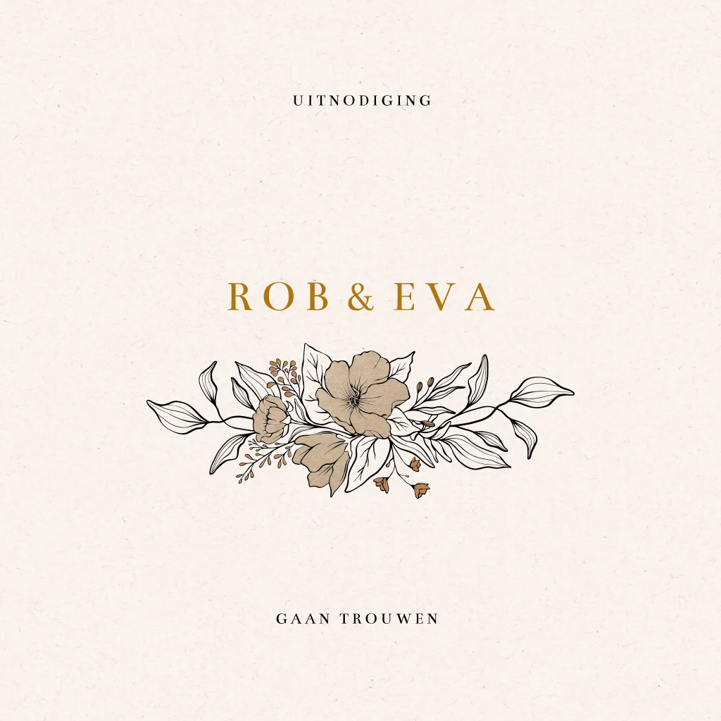 Romantische trouwkaart met een kartonnen achtergrond. Op de voorzijde zie je een bloemenkrans van zacht roze rozen.