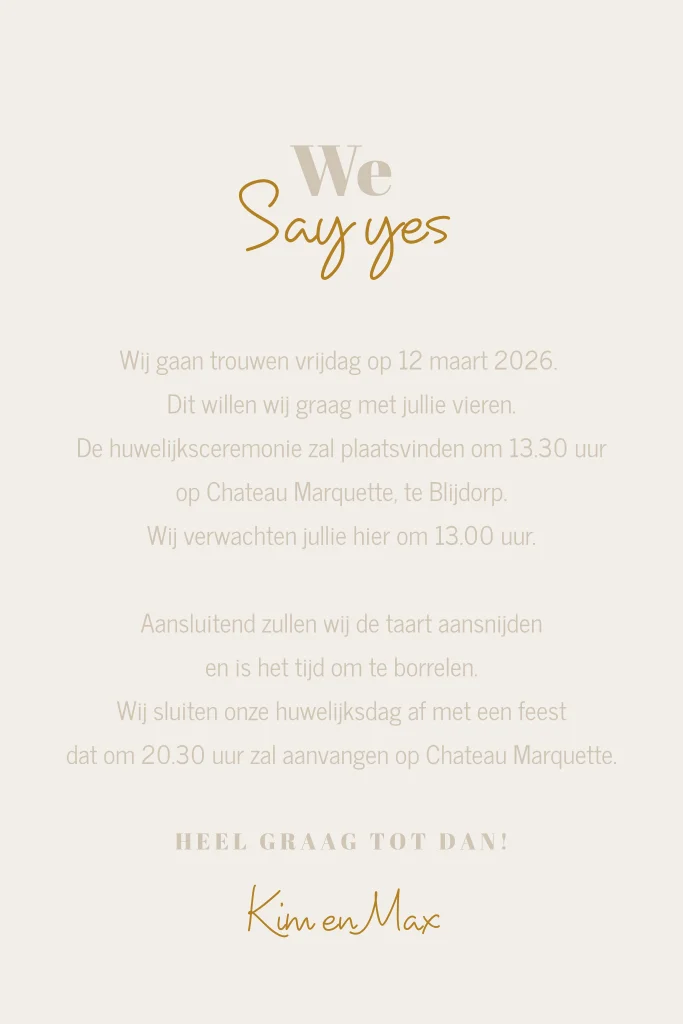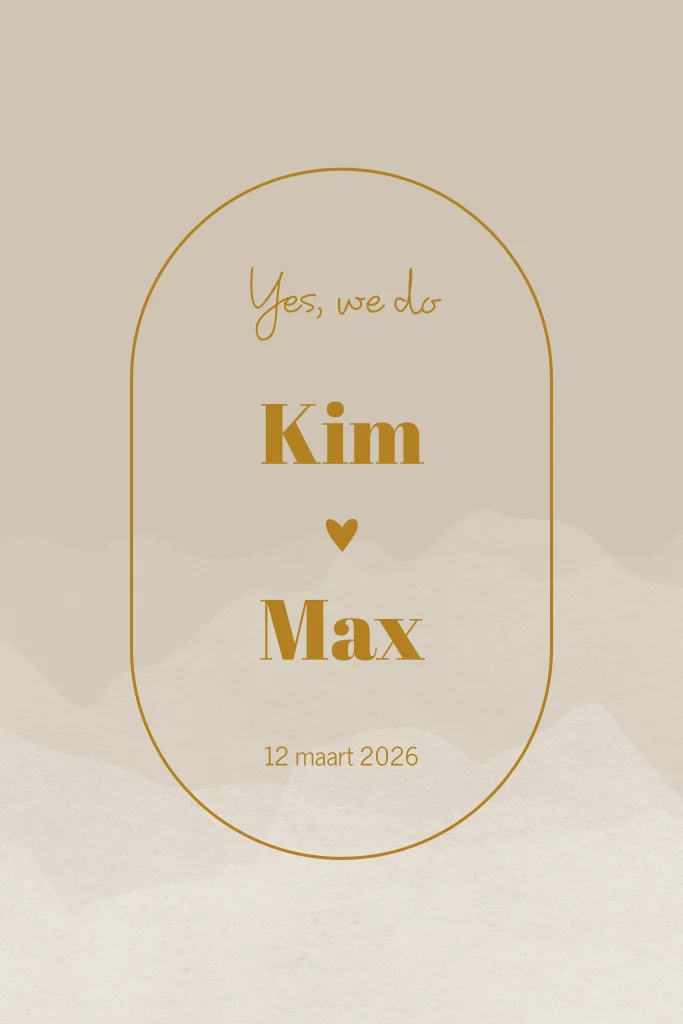 "Yes we do!" En laat dat al je gasten weten met deze trouwkaart. Deze huwelijksuitnodiging met bergen in aquarel, heft afgeronde hoeken. Op deze kaart in natuurlijke aardetinten, de namen van het bruidspaar in een ovalen kader. De kleuren, teksten en lettertypes pas je eenvoudig aan in de editor. Hulp nodig? We helpen je graag.