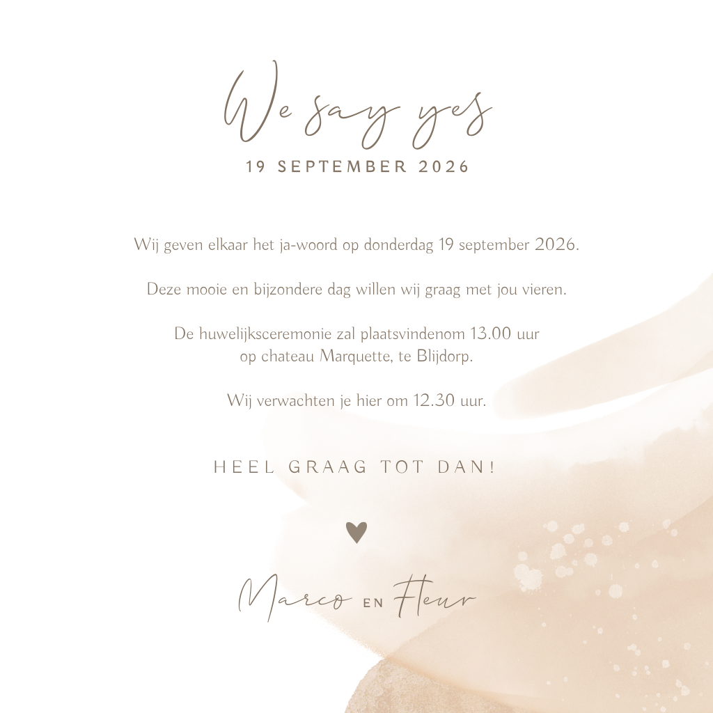 Met deze prachtige trouwkaart met ronde hoeken nodig je al jullie gasten uit voor jullie bruiloft! Op deze huwelijksuitnodiging staan aquarel vegen in een mooie nude tint en jullie namen in een sierlijk lettertype. Pas de datum en jullie namen makkelijk aan in onze editor.