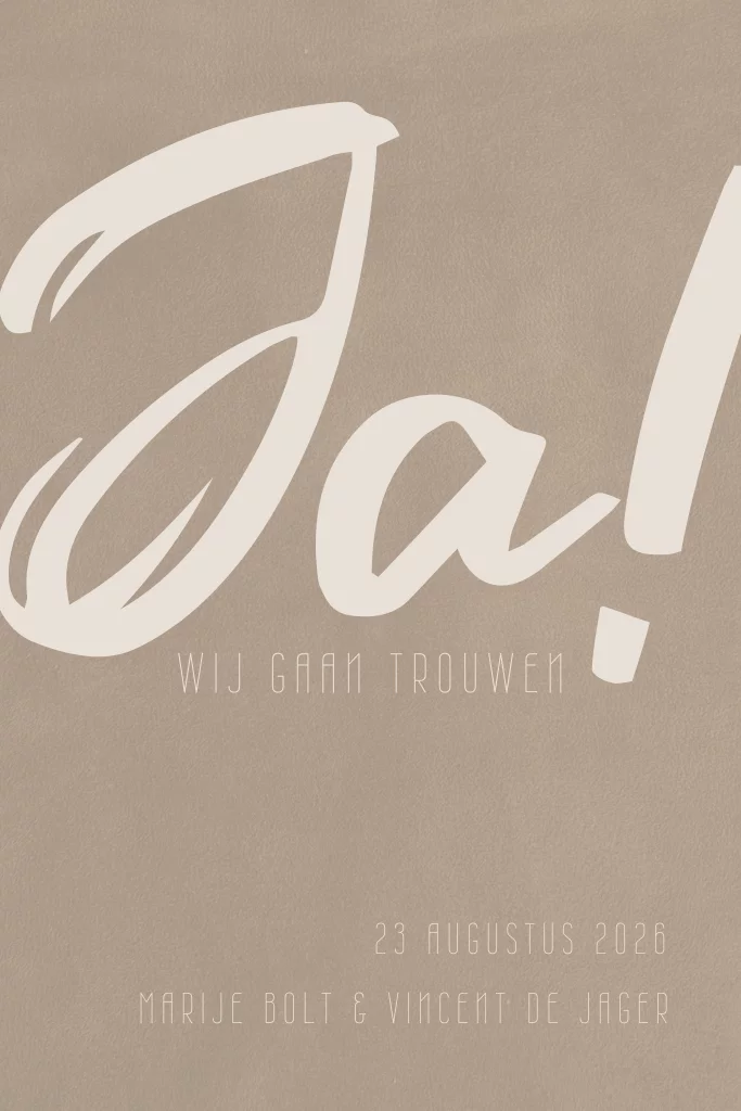 Ja! Jullie gaan trouwen! Dat staat in grote letters op deze huwelijksuitnodiging. Deze basic trouwkaart heeft afgeronde hoeken en een velvetlook achtergrond, wat een zacht ogend effect geeft. Teksten, kleuren en lettertypes pas je eenvoudig aan in onze editor. Toch hulp nodig? We helpen je graag!