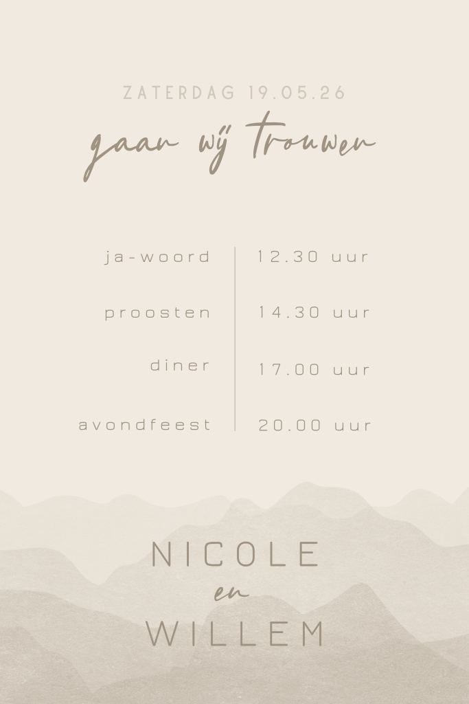 Basic trouwkaart met berglandschap in een rustige bruingrijze tint. Op deze huwelijksuitnodiging staat een tijdlijn om de indeling van jullie grote dag weer te geven.