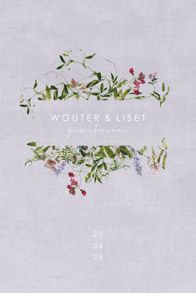 Mooie trouwkaart met afgeronde hoeken en aquarel veldbloemen. De namen van het bruidspaar staan in het midden van de kaart, met daar omheen de veldbloemen in verschillende kleuren. Deze huwelijksuitnodiging heeft een lichte, lila, linnenlook achtergrond. Je kunt deze kaart zelf bewerken in de editor en naar je eigen wensen aanpassen.