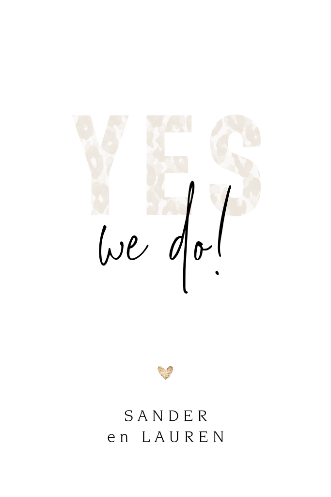 Trouwkaart met ronde hoeken en een clean design. Op deze huwelijksuitnodiging staat de tekst " Yes we do" met een lichte dierenprint achter het woord Yes. Je kunt deze kaart zelf bewerken in de editor en naar je eigen wensen aanpassen.
