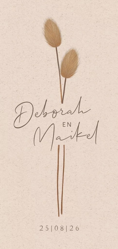 Rustige trouwkaart met afgeronde hoeken. Op deze huwelijksuitnodiging hippe, trendy droogbloemen met de namen van het bruidspaar ertussen in een sierlijk lettertype. De achtergrond heeft een kartonlook.