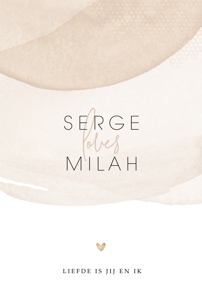 Mooie trouwkaart met aquarel vegen en een honingraat patroon. Deze uitnodiging voor jullie bruiloft, in wit met zachte roze tinten, is extra speciaal door de ronde hoeken. De namen van het bruidspaar staan in een strak lettertype en het kleine gouden hartje maakt het kaartje af. Je kunt deze kaart zelf bewerken in de editor en naar je eigen wensen aanpassen.
