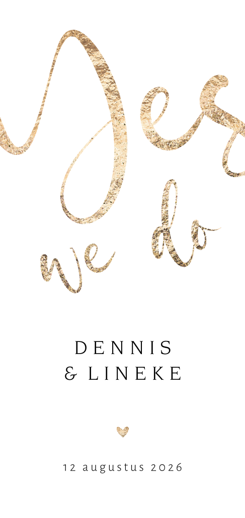 Hippe trouwkaart met ronde hoeken en een clean design. Op deze huwelijksuitnodiging staat in sierlijke goudkleurige letters " Yes we do." Pas deze kaart naar je eigen smaak aan in de editor.