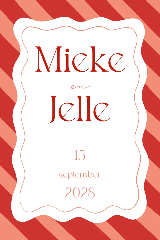 Ontdek deze trouwkaart met trendy rode strepen en een organisch golvend kader rondom jullie namen en trouwdatum. De kleur rood is de kleur van de liefde en deze kleur valt zeker op in deze trouwkaart. Laat je gasten versteld staan van jullie kleurrijke en speelse rode uitnodiging. Zo krijgen jullie genodigden alvast een vrolijke indruk van jullie fantastische trouwdag. De gehele kaart kun je naar eigen wens aanpassen in de online editor.