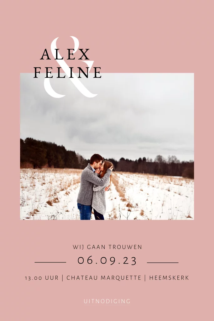Strakke moderne trouwkaart. Deze kaart heeft een mooie warme kleur. Door jullie eigen foto te plaatsen wordt de kaart heel persoonlijk. Deze trouwkaart is onderdeel van onze trouwhuisstijl Rustiek Roze.