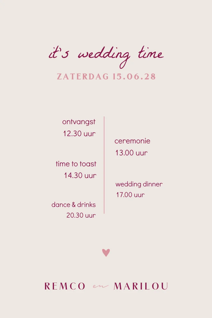 Rustige trouwkaart met tijdlijn om de indeling van dé dag van jullie dromen weer te geven. Op de achtergrond een kartonlook, wat de kaart net wat stoerder maakt.