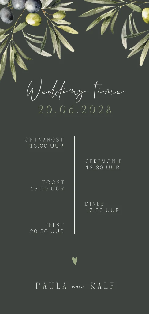 Trouwkaart met tijdlijn en olijftakken. Deze trouwkaart past perfect bij een mediterraanse bruiloft. De trouwuitnodiging heeft prachtige groene kleuren en oogt hierdoor rustig en stijlvol. Met de tijdlijn weten je bruiloftsgasten precies hoe laat de ceremonie, de toost en het feest begint. Of jullie nu een intieme ceremonie in de buitenlucht plannen of een chique feest in een landhuis, deze kaart past perfect bij elke setting. Voeg jullie eigen tekst en details toe en maak de kaart persoonlijk.