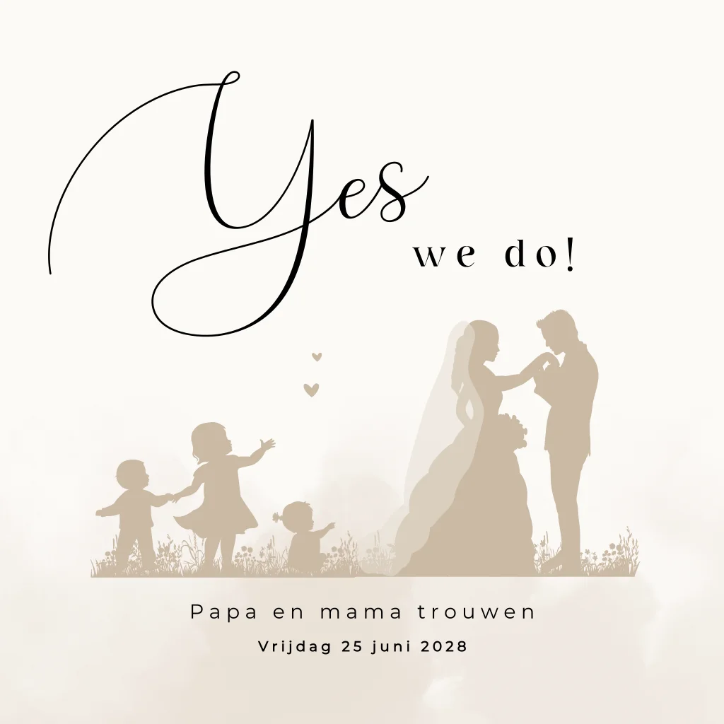 Op zoek naar een trendy trouwkaart met een persoonlijk tintje? Kies dan voor deze papa en mama gaan trouwen trouwkaart met een liefdevol silhouet van papa, mama en kinderen. Deze huwelijksuitnodiging heeft trendy beige kleuren met de tekst 'Yes we do!'. Of het nu gaat om de kleuren, de tekst of het aanpassen van de gezinssamenstelling, wij staan klaar om jullie te helpen bij het creëren van de perfecte trouwkaart.