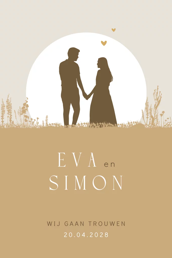 Op zoek naar een trendy trouwkaart met een silhouet van een bruidspaar? Ontdek deze prachtige trouwkaart. Deze kaart heeft mooie beige kleuren en is daarom geschikt voor zowel een winter als een zomer bruiloft. Pas de kleuren, lettertypes en afbeeldingen zelf aan in onze online editor. Hebben jullie kinderen? Voeg deze dan eenvoudig toe op de silhouet trouwkaart.