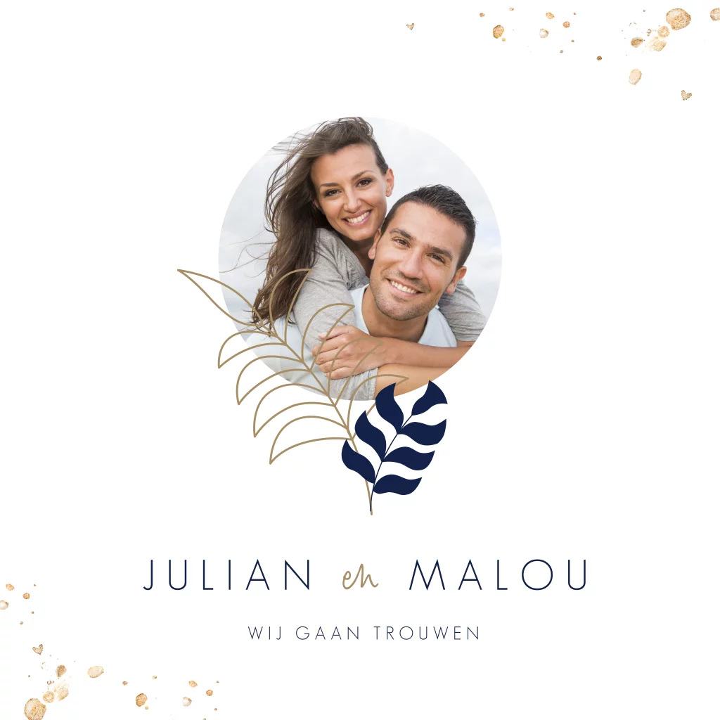 Op deze kaart plaats je een eigen foto. De kaart is overwegend wit met kleine takjes en gouden spetters.