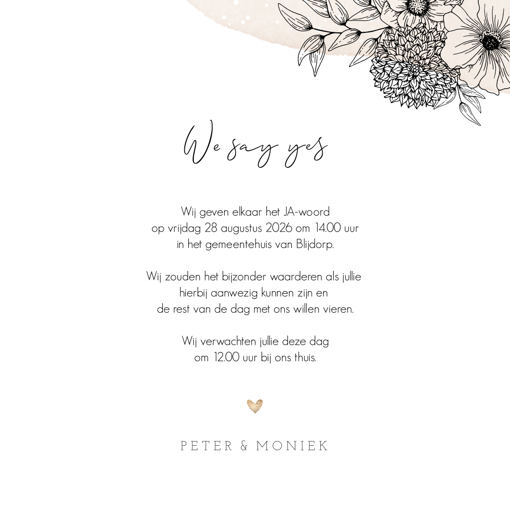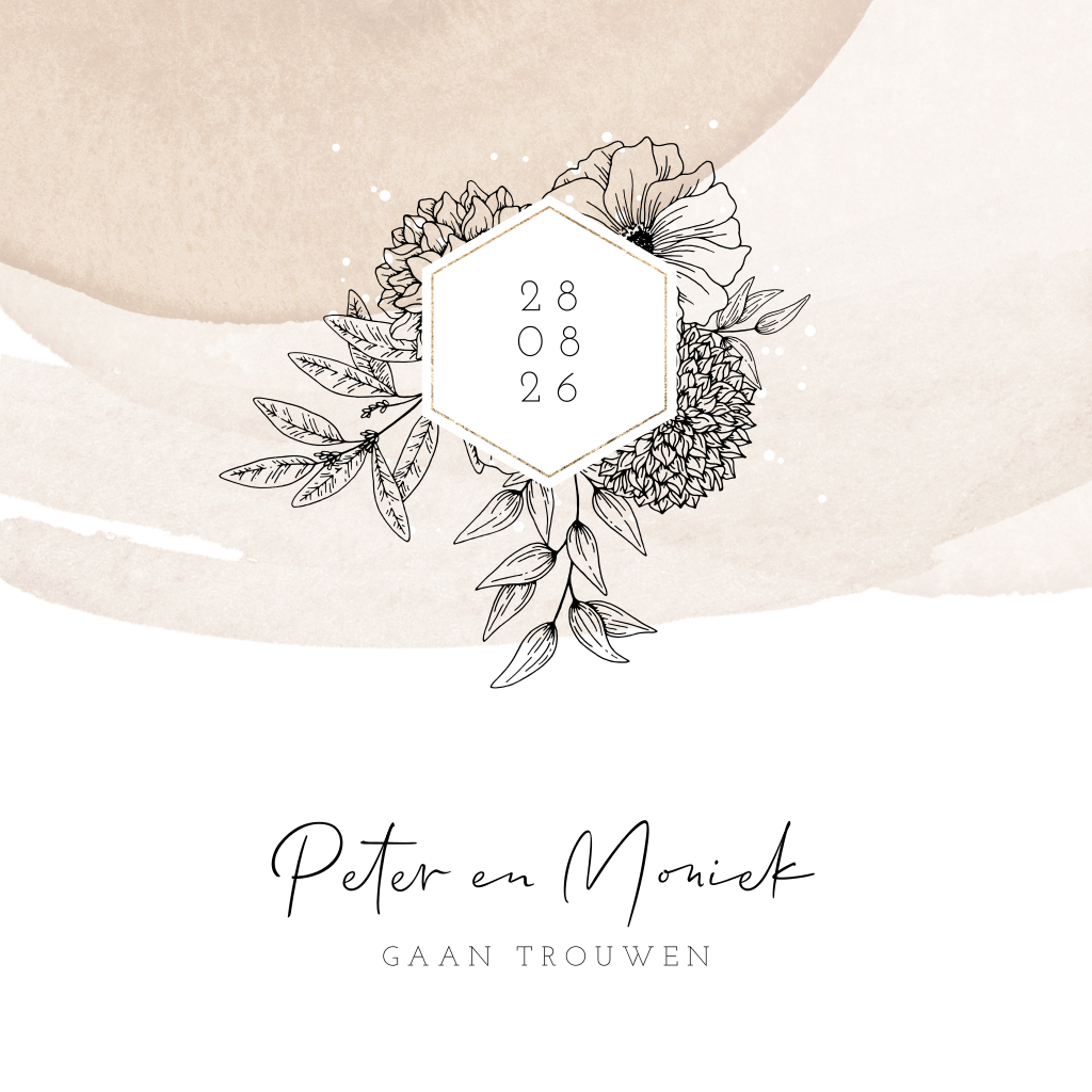 Stijlvolle trouwkaart met zwarte bloemen en een gouden lijn in de vorm van een zeshoek op een aquarel achtergrond. Deze kleurencombinatie maakt de kaart heel chique.