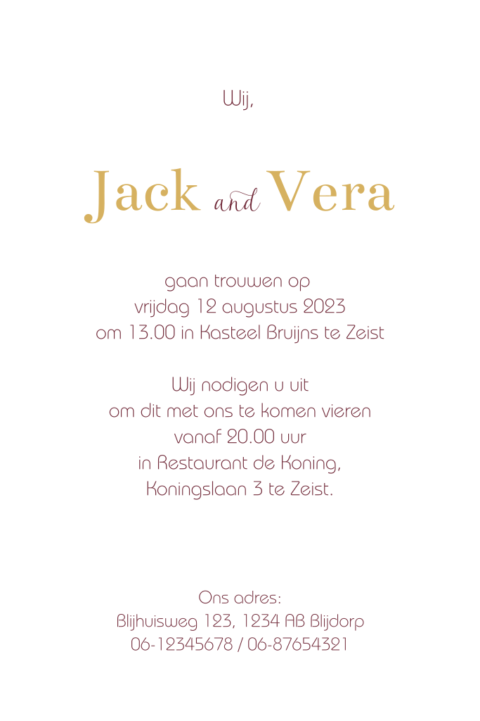 Stijlvolle trouwkaart met sierlijke letters in goudtint. De combinatie bordeaux aquarel met goudtinten maakt de kaart heel chique