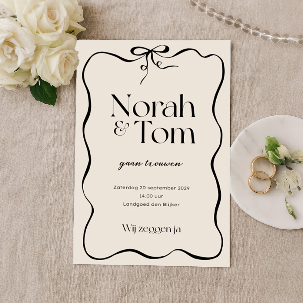 Een stijlvolle trendy huwelijksuitnodiging! Deze trouwkaart is in beige kleurtint vormgegeven met een golvend kader en een speelse geïllustreerde strik. De combinatie van de beige achtergrondkleur en de speelse vormgeving zorgen ervoor dat deze trouwkaart opvalt bij de genodigden. Pas deze trouwkaart naar eigen wens aan in onze online editor voor jullie persoonlijke touch en maak er een onvergetelijke dag van.