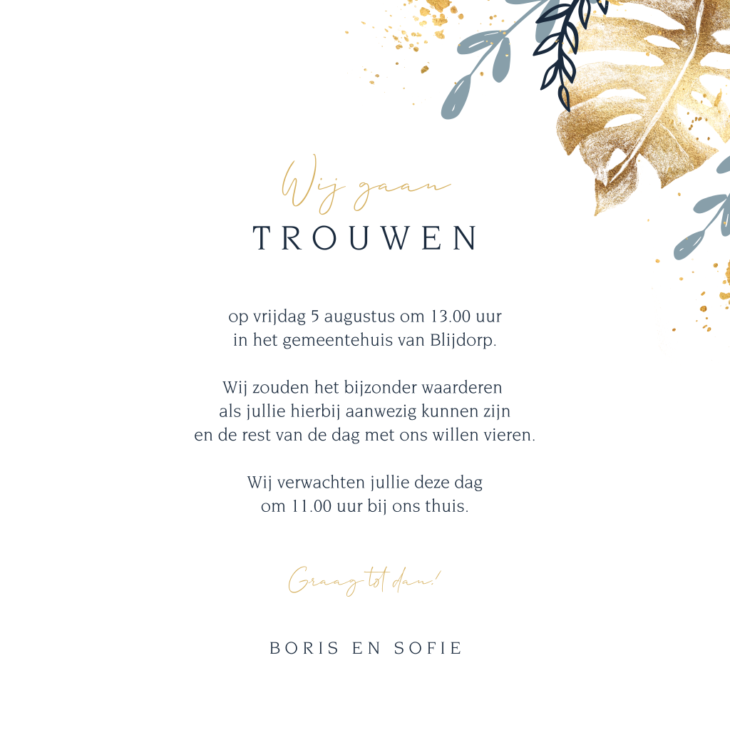Yes we do! Stijlvolle trouwkaart om de gasten voor jullie huwelijk uit te nodigen. Op deze kaart staan mooie takjes in goudkleur en verschillende blauwe tinten. Er is gebruik gemaakt van een strak en een sierlijk lettertype, een mooie combinatie.
