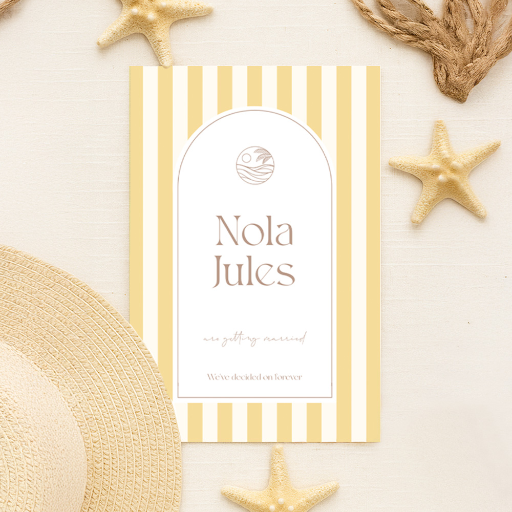 Een fantastische zomerse trouwkaart met een opvallend patroon. Op deze hippe trouwkaart zie je een kader in boogvorm waar de namen van het bruidspaar in staan en een zon met strand en palmboom. Om het kader heen zie je een geel gestreepte patroon. Een lekker zomerse trouwkaart dus voor een echte zomer bruiloft! Pas deze kaart naar eigen wens aan in onze online editor en maak er een onvergetelijke trouwdag van!