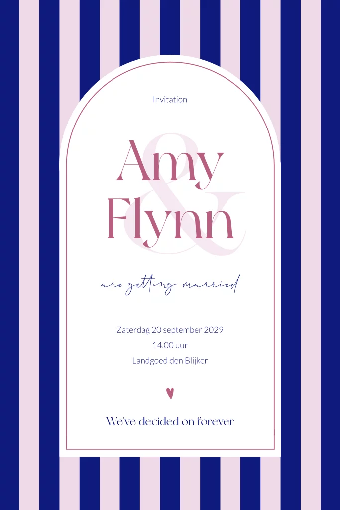 Een fantastische trouwkaart met een opvallend patroon. Op deze hippe trouwkaart zie je een kader in boogvorm waar de namen van het bruidspaar in staan. Om het kader heen zie je het gestreepte patroon in roze en blauwe kleurtinten. Pas deze kaart naar eigen wens aan in onze online editor en maak deze trouwkaart af met de berry envelopkleur en bijpassende sluitzegel. Maak er een onvergetelijke trouwdag van!