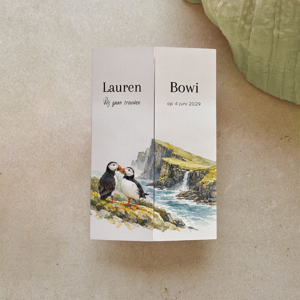 Op zoek naar een originele trouwkaart? Dan is deze trouwkaart met luikvouw en natuurlijk design iets voor jullie! Deze trouwkaart valt zeker op door de theatervouw maar ook door het design. Op deze huwelijksuitnodiging zie je een aquarel illustratie van een natuur landschap van bergen en rotsen met een waterval. Op de voorzijde staan papegaaiduiker vogels. Ideaal voor stellen die gek zijn van de natuur, dieren en puffin vogels. Wij raden af om doorlopende elementen of teksten over de deurtjes te plaatsen. Vanwege de vouwlijn en afwerking zullen deze elementen niet perfect op elkaar aansluiten.