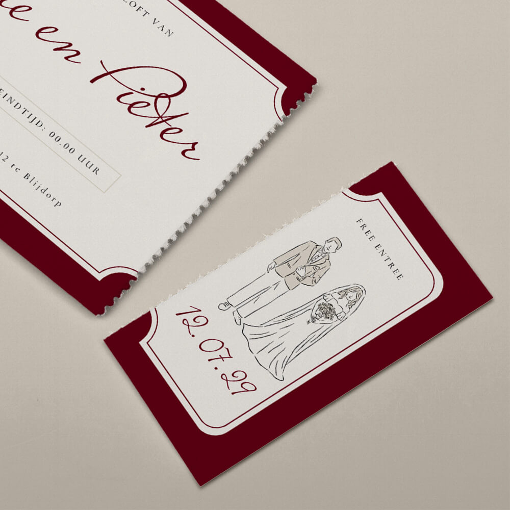 Trouwkaart in ticketvorm met afscheurbaar ticket en lijntekening