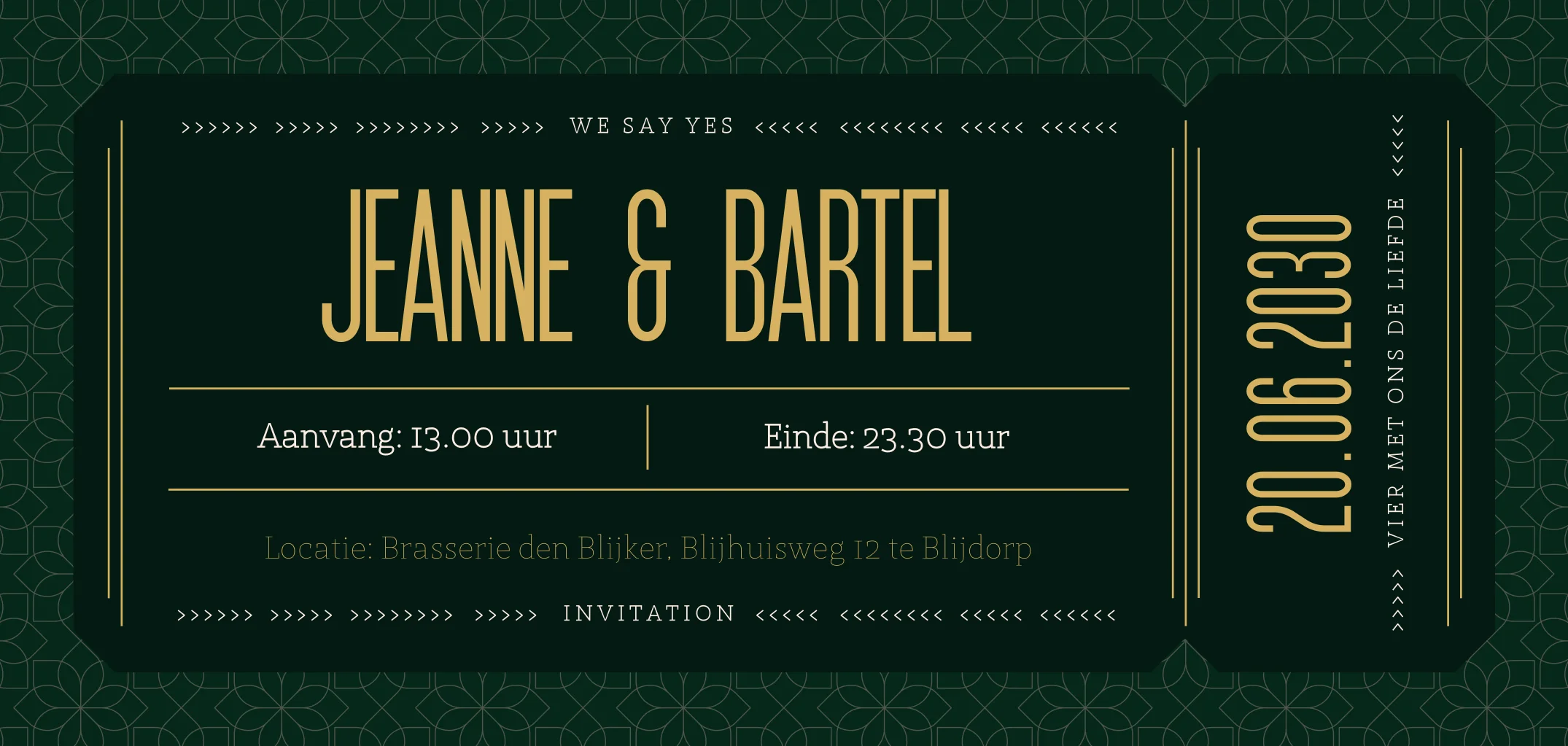 Trouwkaart in ticketvorm met een origineel en apart design. Deze trouwkaart is typografisch met een art deco bloemen patroon. Pas naar eigen wens de kleuren en lettertypes aan in onze online editor. Hulp nodig? Ons team helpt je graag!