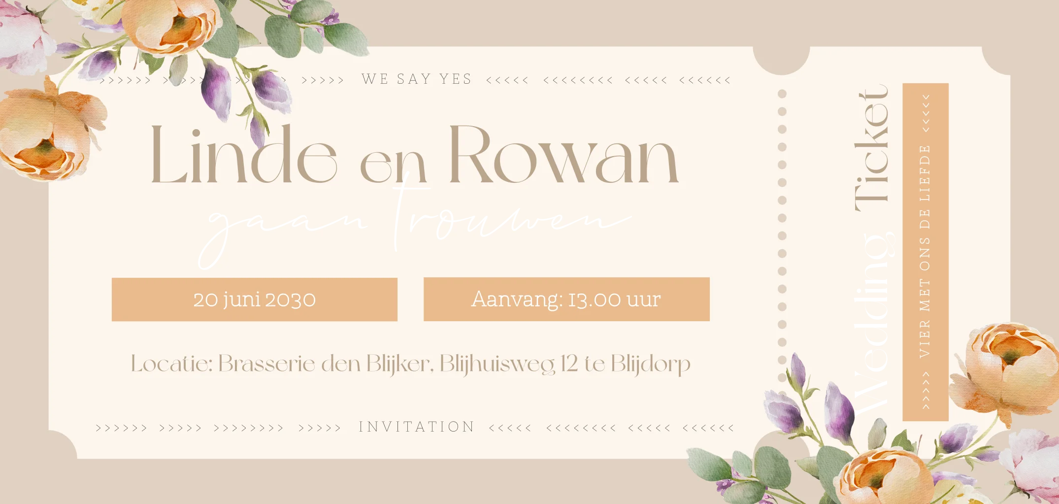 Op zoek naar een unieke trouwkaart voor jullie bruiloft? Deze trouwkaart als ticket is opvallend en origineel. De ticketstijl huwelijksuitnodiging heeft warme zachte kleuren met een beige kader en kleurrijke bloemen. De goudfolie maakt deze trendy en romantische trouwuitnodiging helemaal af en voorziet het van een luxe tintje. Pas naar eigen wens de kleuren en lettertypes aan in onze online editor. Hulp nodig? Ons team helpt je graag!