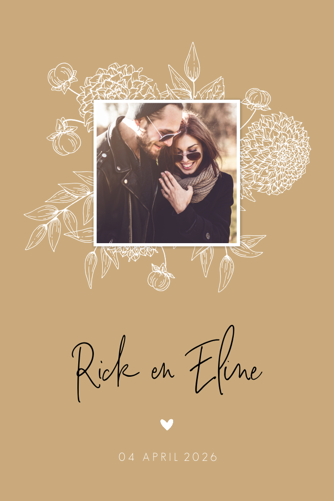 Trendy trouwkaart met bloemen in de vorm van een lijntekening. Een mooie combinatie van de kleuren zwart, wit en beige. Jullie namen in het zwart komen mooi naar voren. Plaats je eigen foto en maak je eigen unieke uitnodiging.