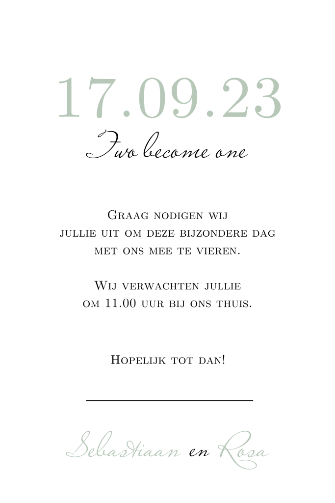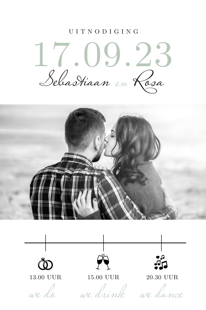 Kondig jullie huwelijk aan met deze hippe foto trouwkaart. Op deze trouwkaart staat de datum van de grote dag groot op de kaart. Onder de foto een tijdlijn met symbolen om de dagindeling weer te geven. Kleuren en lettertypes, evenals de symbolen zijn aan te passen. Deze trouwkaart is onderdeel van onze trouwhuisstijl Trendy Tijdlijn.