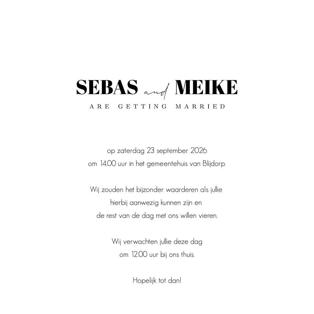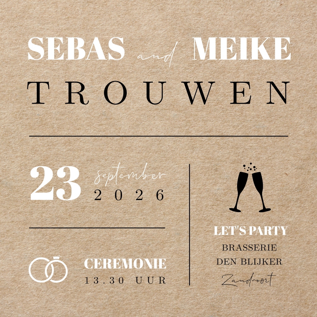 Hippe typografische trouwkaart met een karton achtergrond. Op deze kaart staan diverse symbolen zoals ringen, champagne en taart. Er zijn verschillende lettertypes gebruikt en de tekstkleuren zijn wit en zwart. De teksten en symbolen zijn gemakkelijk aan te passen.