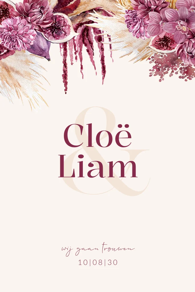 Trouwkaart met afgeronde hoeken en bloemen met siergrassen. De trouwkaart heeft een beige achtergrond met &-teken en bovenaan prachtige paarse bloemen. De afgeronde hoeken maken het geheel helemaal af. Pas de teksten, kleuren en lettertypes naar je eigen smaak aan in de editor. Ook kun je zelf bepalen of je ronde hoeken wilt.